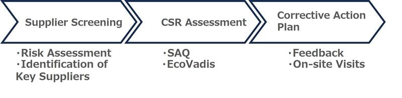To this end, the Nitto Group conducts an annual CSR assessment to support the enhancement of transparency and performance in our partners' CSR activities. We first identify key suppliers through a multi-faceted primary screening, followed by a detailed assessment. The results of the assessment are shared as feedback reports, encouraging voluntary improvements through suggested actions. Furthermore, where necessary, we request corrective measures or improvement plans and, through ongoing support, work together with our partners to build a highly transparent and sustainable supply chain.