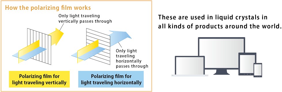 A polarizing film is an optical film that allows the display to show its image by controlling the amount of light. Its performance is an important factor affecting the image quality of the screen. Nitto’s polarizing film is the world’s top level technology, contributing to thinner, larger, and high image quality liquid crystal displays. It is used in many of the LCD screens in the world including smartphones, tablet PCs, TVs, and vehicle displays and continues to evolve as the devices themselves evolve.