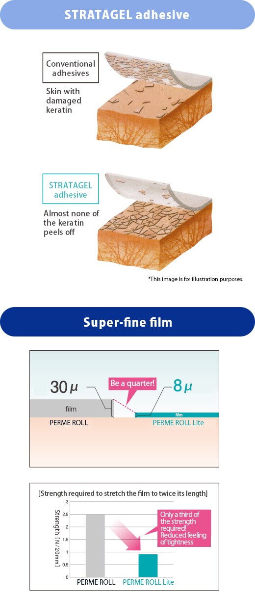 The gentleness to the skin comes from the adhesive of the XTRATA surgical tape that prevents keratin come off the skin. Since it uses a soft gel adhesive, it conforms perfectly to the fine irregularities of the skin and at the same time results in very little pain when peeled off. In addition, by reducing the thickness to one quarter that of the conventional product, it is comfortable to wear, stretches easily and offers a smooth sensation on the skin. Nitto will continue to pursue further thinness and comfort.