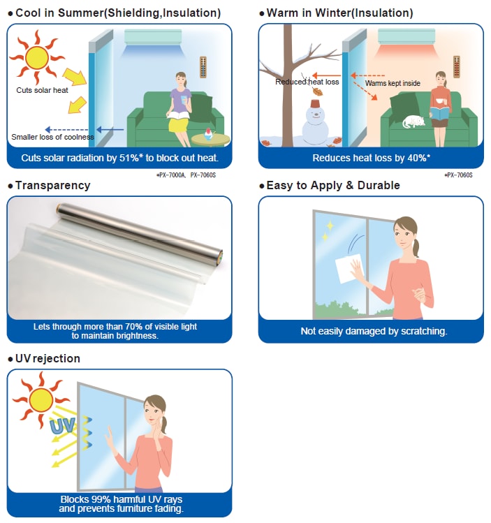 PX-7060S reduz cerca de 50% do calor solar, melhorando a eficácia de refrigeração durante a temporada de calor no verão, e bloqueia mais de 99% dos raios UV, prejudiciais à saúde e à conservação de mobílias.