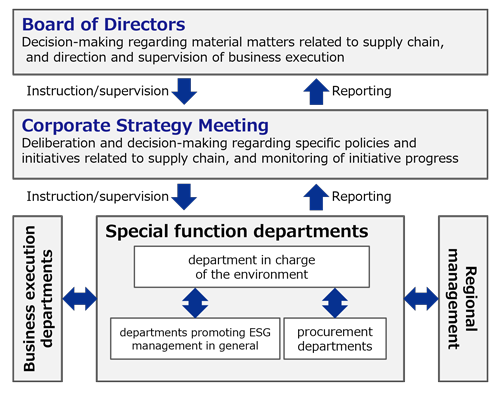 Risks and opportunities related to the environment, including nature, are monitored through collaboration between Business execution departments and Regional management, with the department in charge of the environment bearing overall management responsibility. Information regarding monitored risks and opportunities is reported and discussed every month at the Corporate Strategy Meeting, which consists of directors and executive officers, together with other information managed by specialized departments. The results of the deliberations are immediately communicated to the relevant departments, measures against risks and opportunities are promptly implemented, and efforts are made to strengthen controls. Details on implementation and status on improvement are reported and reviewed once again at the Corporate Strategy Meeting, thereby enhancing the effectiveness of the Group’s management.