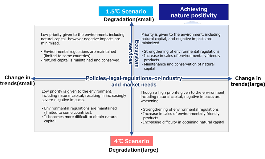 We are developing scenarios that envision the potential states of the world related to “ecosystem services,” which are closely linked to physical risks affecting business activities, and “policies, legal regulations, or industry and market needs,” which are closely associated with transition risks.