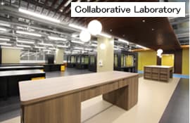 | Zona de I+D Este espacioso laboratorio permite a los investigadores de varios campos trabajar conjuntamente, además de facilitar una comunicación espontánea. Nitto espera que mostrar la preocupación por la seguridad y promover la comunicación conduzcan a la innovación. | ![]() |