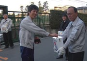 | Este mismo tifón causó también enormes daños y se cobró la vida de 163 personas en la zona central de Vietnam. Nitto Denko Vietnam Co. Ltd. organizó una recaudación de fondos y realizó una donación de 30 000 000 VND (aproximadamente 145 000 yenes), cantidad recaudada tanto por Nitto Denko Vietnam como por sus empleados para la zona del desastre a través del parque industrial de Vietnam y Singapur (VSIP, por sus siglas en inglés), donde se encuentra la empresa. | ![]() Izquierda: el presidente de un sindicato de trabajadores de Nitto Vietnam entregando una donación económica |