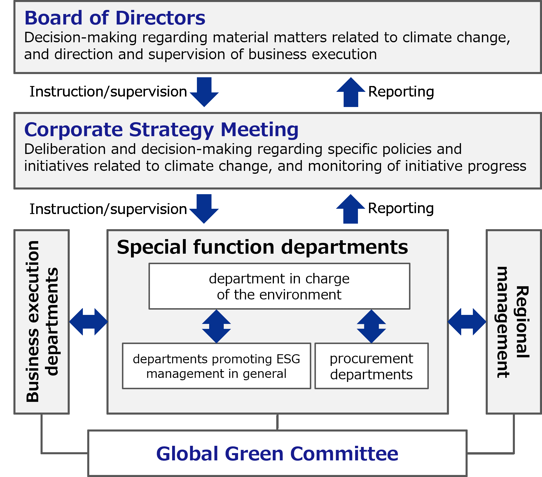 The Corporate Strategy Meeting, chaired by the President-Director and CEO, is responsible for deliberation and decision-making regarding specific policies and measures for action based on management policies and management indicators regarding the environment including climate change, as well as managing risks and opportunities and monitoring progress towards achieving targets on a monthly basis. It provides periodic reports––on a quarterly basis––to the Board of Directors on its deliberations and decisions and the progress of initiatives, and, as necessary, provides additional reports if a material matter arises. Additionally, to ensure that the matters deliberated and decided are promptly disseminated throughout the company, the Corporate Strategy Meeting comprises all Vice Presidents who are in charge of business execution departments, special function departments, and regional management.