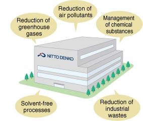 In conformity with our corporate vision, voluntary environmental action plans and other environmental regulations, the Nitto Group approaches global environmental conservation with two goals in mind; the "reduction of environmental load associated with business activities" and the "development of business conducive to environmental conservation".