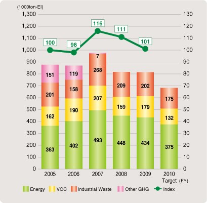 Our unit CO2 emissions (CO2 emissions per 1 million yen of production output) throughout fiscal 2009 improved 12% in comparison to fiscal 2008 and total CO2 emissions reduced 4.5% (approximately 30,000 metric tons) compared to fiscal 2005. The most significant improvements made stemmed from the reduction of CO2 emissions as a result of energy savings throughout the years.