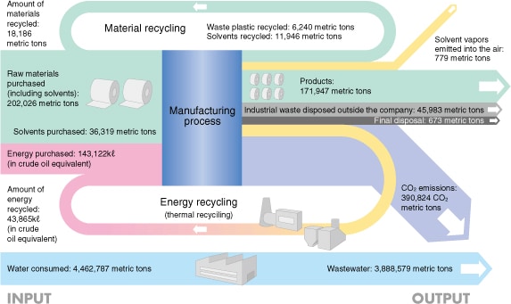 *2: A unique unit utilized by the Nitto Group, indicating environmental load into which we convert energy purchased, industrial waste generated, VOC purchased and the like through the use of a coefficient (unit: ton-EI)
