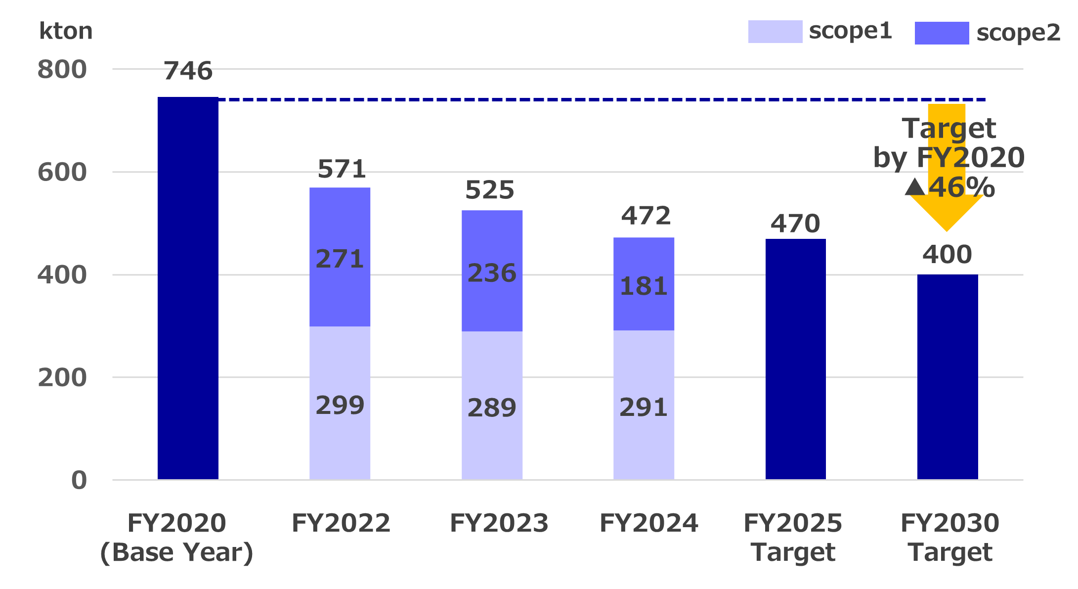 We are on track to achieve our 2030 CO2 emissions target (Scope 1+2) of 470,000 tons set in May 2022 ahead of schedule. As such, in fiscal 2024, we decided to aim to achieve 470,000 tons in 2025, and revised our 2030 target to 400,000 tons, a higher target in line with the 1.5°C target based on science*1.