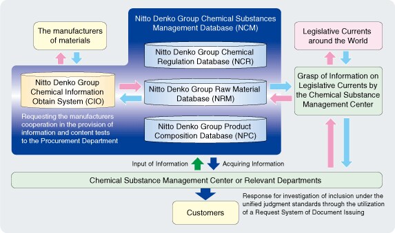 To prevent the use of chemical substances which are harmful to humans and the environment, the Chemical Substance Management Center has established self-management regulations regarding the management of chemical substances used. The center continues to control raw material procurement within the group. The "Nitto Group Chemical Substances Management Database (NCM)" began in December 2008. In fiscal 2009 the center joined alongside other departments in our commitment towards wanting to ensure that we are responsive to customer inquiries about chemical substances that are used in our products.