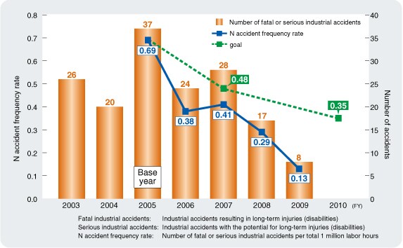 In an attempt to achieve the Group's objective of "Zero Fatal or Serious Industrial Accidents", the Nitto Group has continued to implement robust safety activities at each base. For a long time, fatal or serious industrial accidents have been steadily reducing, however on 21 January 2010, an accident occurred at one of our bases in China and an employee died as a result. During a production process, an unusual work practice caused the generation of a poisonous gas which was inhaled by the employee and who died as a result.