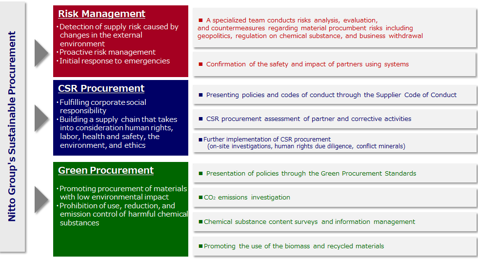 Группа Nitto стремится к экологичным закупкам посредством таких инициатив, как «Управление рисками», «Закупки на основе КСО» и «Экологичные закупки». Эти инициативы согласованы с политикой группы Nitto, в рамках которой вопросы ESG являются основой процессов управления и реализуются в рамках программы ESG для поставщиков. Цель этих закупок — выявление и снижение рисков, связанных с перебоями в цепочке поставок, нарушениями прав человека и экологическими проблемами, такими как сокращение выбросов CO2, в ответ на изменения рыночных условий.