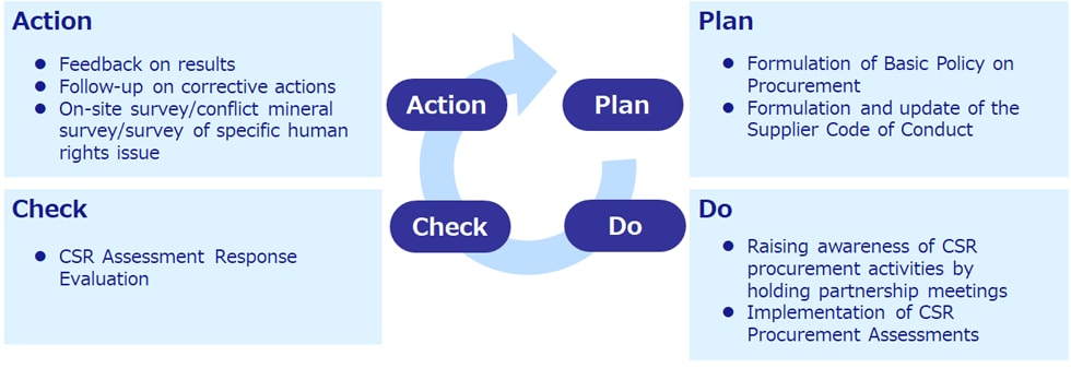 Наш процесс закупок на основе КСО осуществляется в рамках цикла PDCA, как показано на схеме.