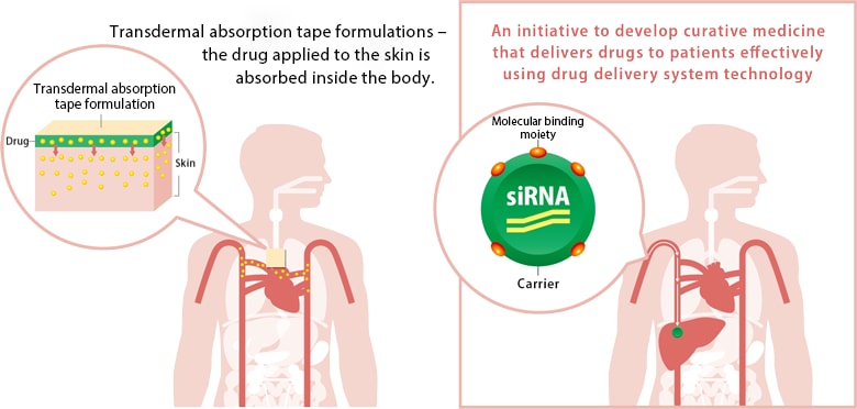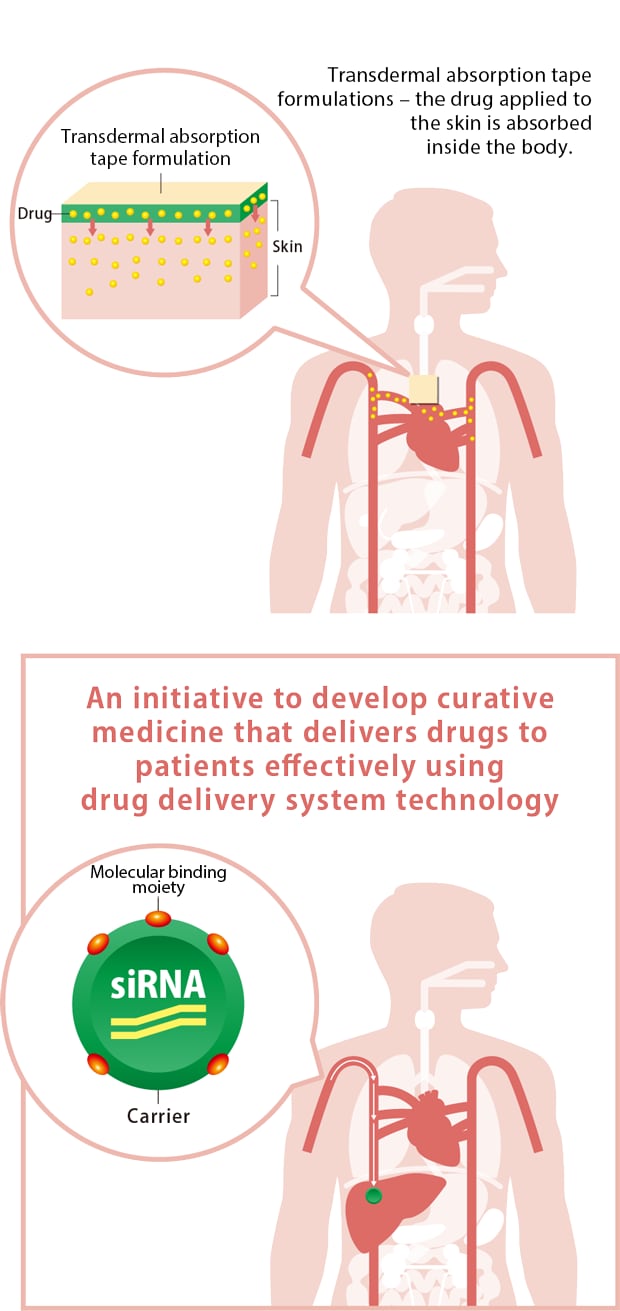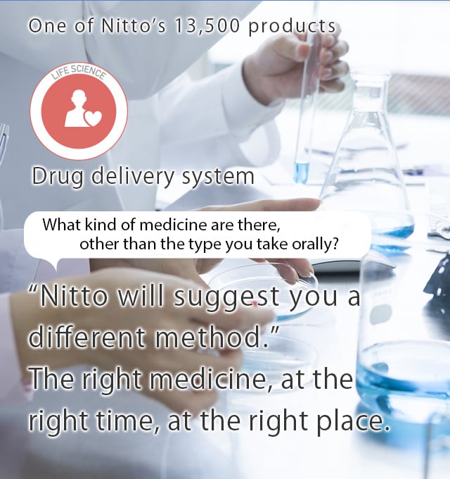 There are various ways to take medicine, including taking it orally or by injection. By developing drug delivery systems that deliver the necessary medication to the necessary places, Nitto helps give patients peace of mind. For example, one method is “transdermal absorption tape formulation” which infuses tape with medication which is then absorbed by the body through the skin. We are also working on the development of therapeutic drugs for intractable diseases that can efficiently deliver drugs to affected areas using a drug delivery system that targets specific molecules.