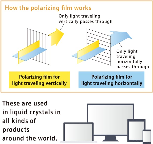 A polarizing film is an optical film that allows the display to show its image by controlling the amount of light. Its performance is an important factor affecting the image quality of the screen. Nitto’s polarizing film is the world’s top level technology, contributing to thinner, larger, and high image quality liquid crystal displays. It is used in many of the LCD screens in the world including smartphones, tablet PCs, TVs, and vehicle displays and continues to evolve as the devices themselves evolve.