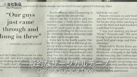When peeling off general surgical tape, the surface of the newspaper sticks to the adhesive surface, and the newspaper itself rips. On the other hand, XTRATA only adheres to the printed surface, and the paper doesn’t tear at all.