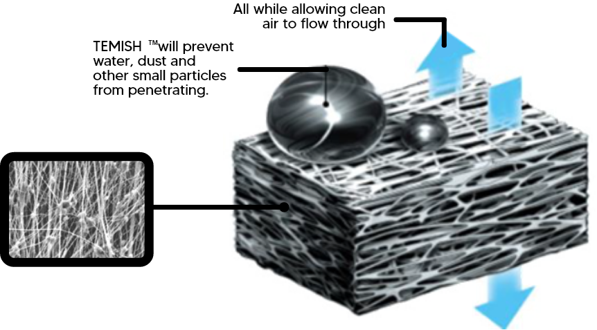 TEMISHTM is formed by stretching the PTFE to create hundreds of millions of micro pores per sq. cm. The resulting nano-fiber allows air through without letting particles such as water and dust pass.