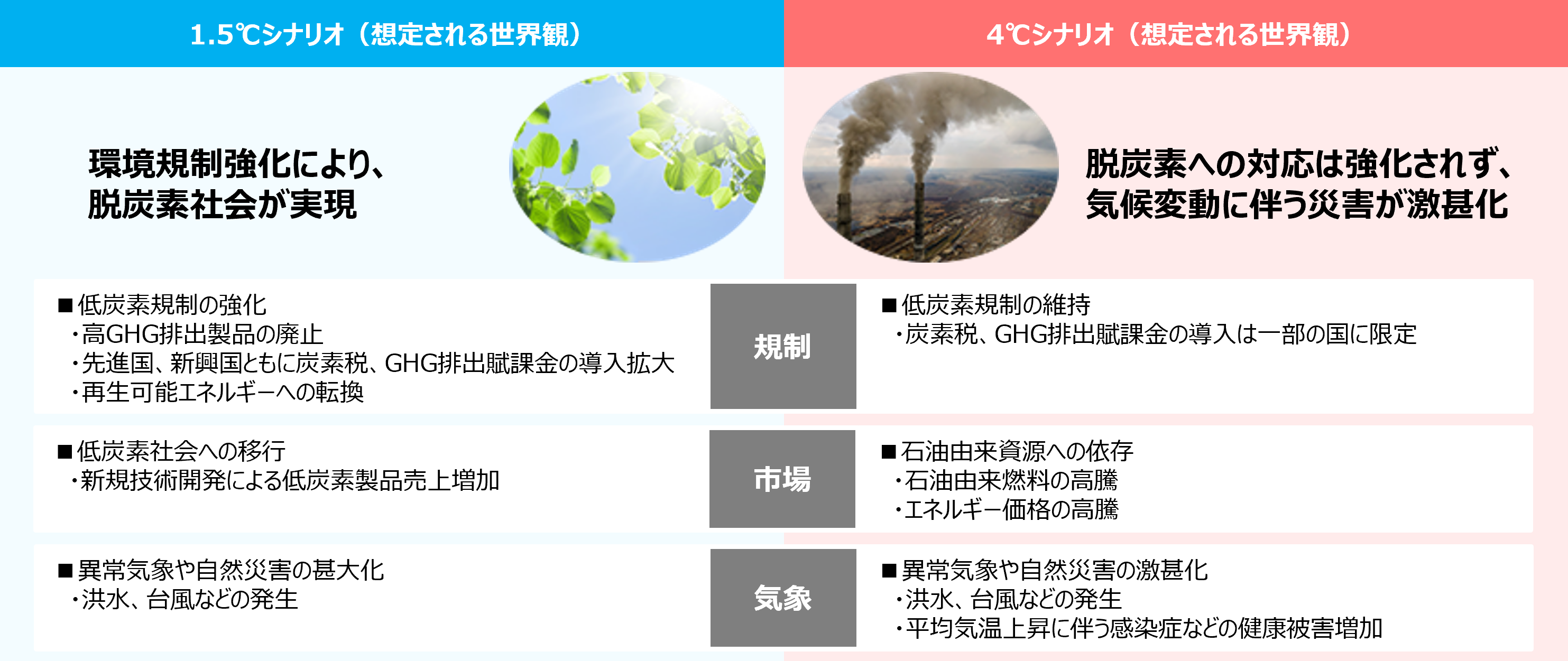 気候変動に伴う事業環境変化が、自社の事業や経営に与える影響を予想し、想定される世界観(シナリオ)を作成しています。2050年を見据え、世界の平均気温の上昇を産業革命以前に比べて1.5℃に抑えることを目標とした「1.5℃シナリオ」、および世界平均気温が、工業化以前と比べて3.2~5.4°C上昇する可能性の高い「4℃シナリオ」について検討をしています。