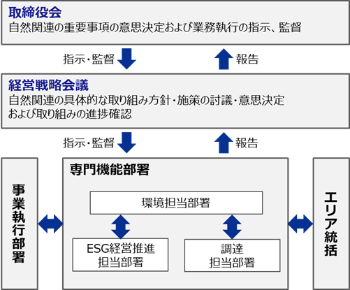 自然を含む環境課題への取り組みを推進する担当役員を任命し、取り組みを実行する専門機能部署を環境担当部署としています。環境担当部署は自然への依存・影響およびリスク・機会を定期的に評価し、戦略検討、課題への対応策の実行・推進を行っています。環境担当役員はそれらの評価結果や検討内容および実行・推進状況について管理・監督を行っています。また、これら取り組みの進捗状況については、環境担当部署が経営戦略会議へ定期的に報告しています。