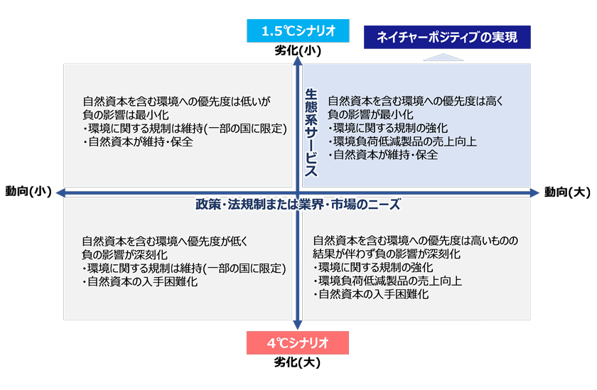2050年を見据え、下図のとおり自然への優先度が高く(政策・法規制または業界・市場ニーズなどの動向が高まり)かつ生態系サービスの劣化が最小化している状態および自然への優先度が低く(政策・法規制または業界・市場ニーズなどの動向は変化しないもしくは衰える)かつ生態系サービスの劣化が大きい状態について検討しています。