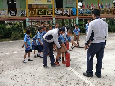 ![]() 消火器の使い方を学ぶ生徒たち |