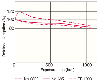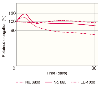 ![]() # 1 덤벨 다이를 사용하여 준비한 시편을 각기 다른 온도 조건에 노출했습니다. 각 시간 간격이 끝날 때 500mm/분의 속도로 시편을 늘렸고, 파단 직전의 최대 신장율을 측정했습니다. 새로운 시편의 신장율(%)로 유지 신장율을 계산했습니다. 측정 온도: 80°C |
