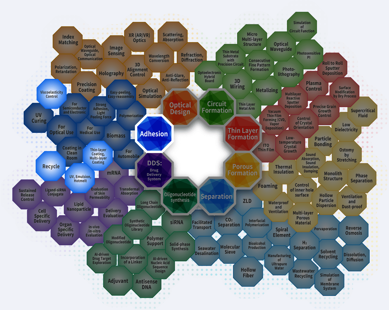 At Nitto Group, based on 8 core technologies, dozens of peripheral technologies have been researched and developed. These technologies have been combined to create a “composite of technologies”,