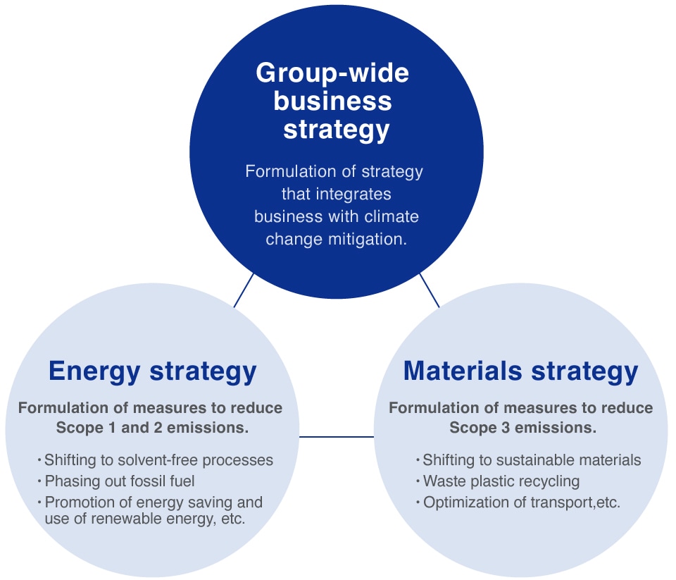 The Nitto Group has set “Realizing a decarbonized society” as one of its material issues for sustainability and is strengthening its efforts to combat climate change. To solve environmental issues including climate change, the Group is working to develop and promote short- to mid-term and long-term strategies by establishing a governance system where President-Director & CEO is appointed as the superintendent, and the Corporate Strategy Meeting plays the central role under the direction and supervision of the Board of Directors.