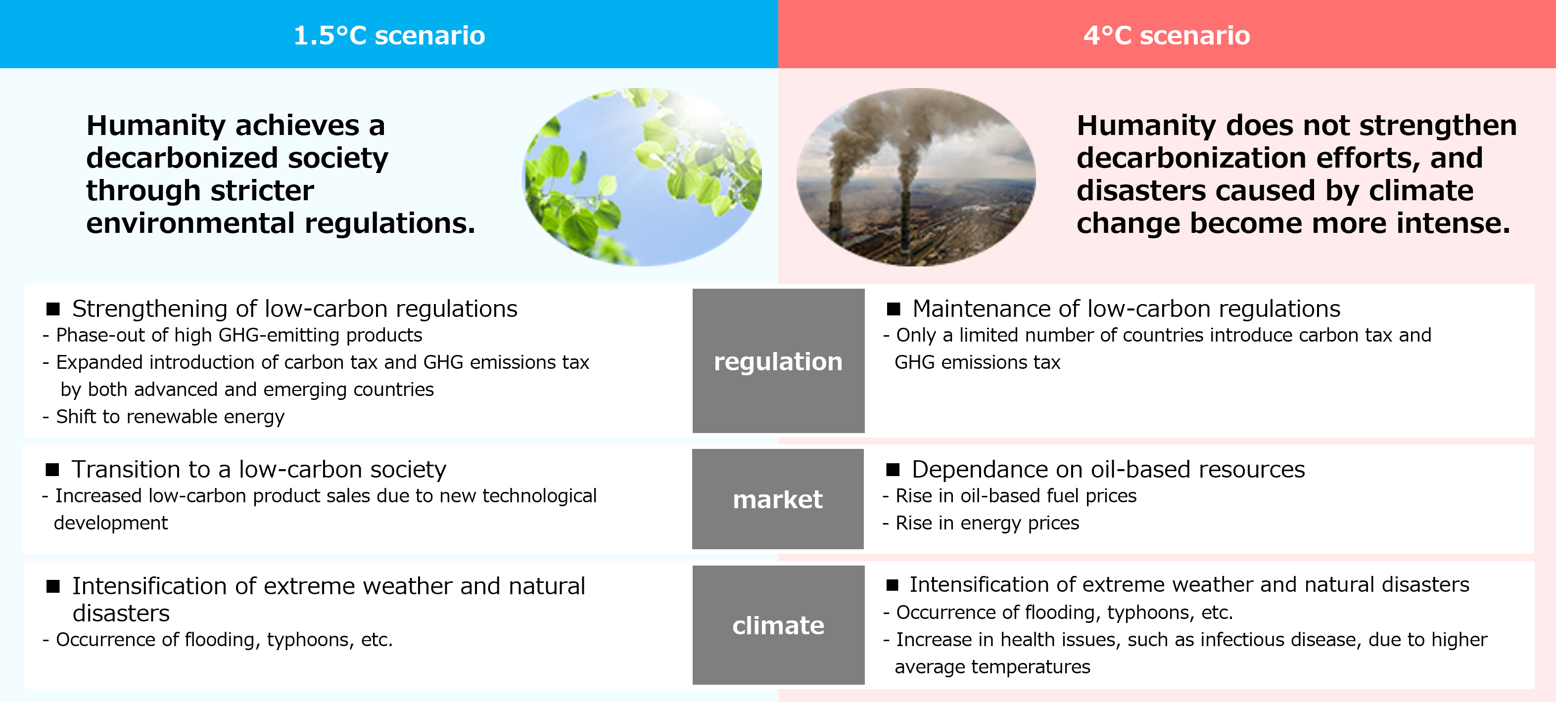 We forecast the impact that changes in the business environment caused by climate change may have on our businesses and management, and then create scenarios based on this. We consider the “1.5°C scenario,” under which the average global temperature does not exceed that of preindustrial times by more than 1.5°C by 2050, and the “4°C scenario,” under which the average global temperature is likely to exceed that of preindustrial times by 3.2 to 5.4°C by 2050.