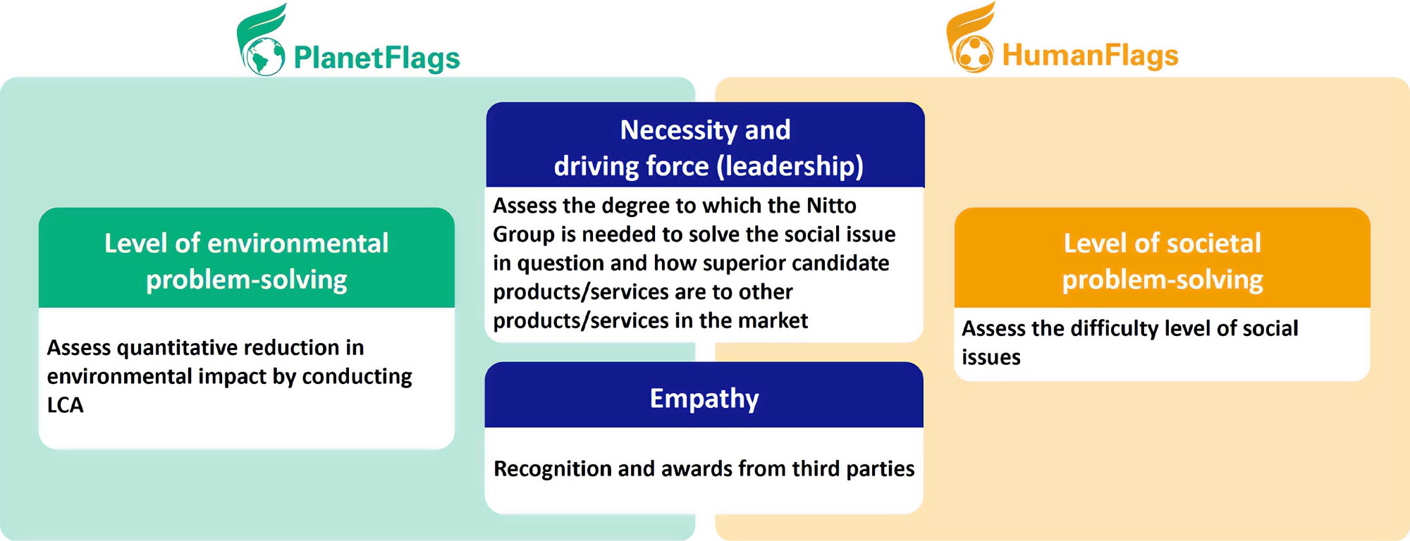 In fiscal year 2022, the Nitto Group established a recognition scheme for products and services that contribute to the environment and human society. By visualizing these contributions and recognizing those with particularly high impact as PlanetFlags™/HumanFlags™, we demonstrate our commitment to material issues for sustainability (materiality).