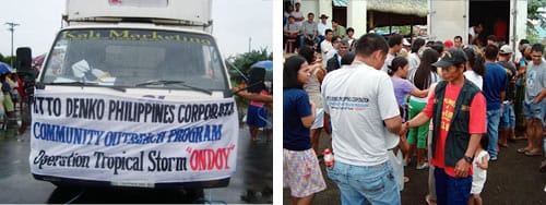 2009 yılında Eylül sonlarından Ekim ayının ilk günlerine dek "Ketsana" tayfunu Güneydoğu Asya’yı talan etti. Nitto Denko (Filipinler) Corporation’ın bulunduğu* Laguna Vilayetindeki Calamba şehrinde, Büyük ölçekli bir sel baskını, pek çok insanın evlerinin hasar görmesine neden oldu. Evler hem su baskını altında kaldı hem de ciddi akıntılarla tahrip oldu ve her yerde toprak kaymaları meydana geldi. Nitto Denko (Filipinler) çalışanları, tüm şehirde felaketzedeler arasında kendi elleriyle 150,000 pezo (yaklaşık olarak 300,000 yen) muadilindeki gıda paketlerini dağıttı.
