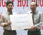 | Aynı tayfun, keza, Vietnam’ın merkezinde 163 kişinin yaşamını olumsuz etkileyen büyük bir hasara da neden olmuştu. Nitto Denko Vietnam Co. Ltd., bir para toplama çabası organize etti, gerek Nitto Denko Vietnam gerekse onun çalışanları tarafından bağışlanan, 30,000,000 dong'luk (yaklaşık olarak 145,000 yen) bağış, şirketin bulunduğu, tüm Vietnam Singapur Endüstri Parkının yer aldığı, felaketin vurduğu bölgeye gönderildi. | ![]() Sol: Para bağışını veren Nitto Vietnam işçi birliği başkanı |