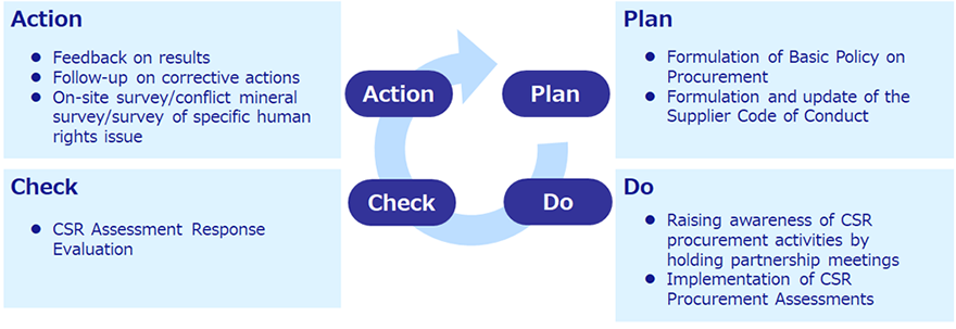 我們的 CSR 採購流程透過 PDCA 週期進行,如圖所示。